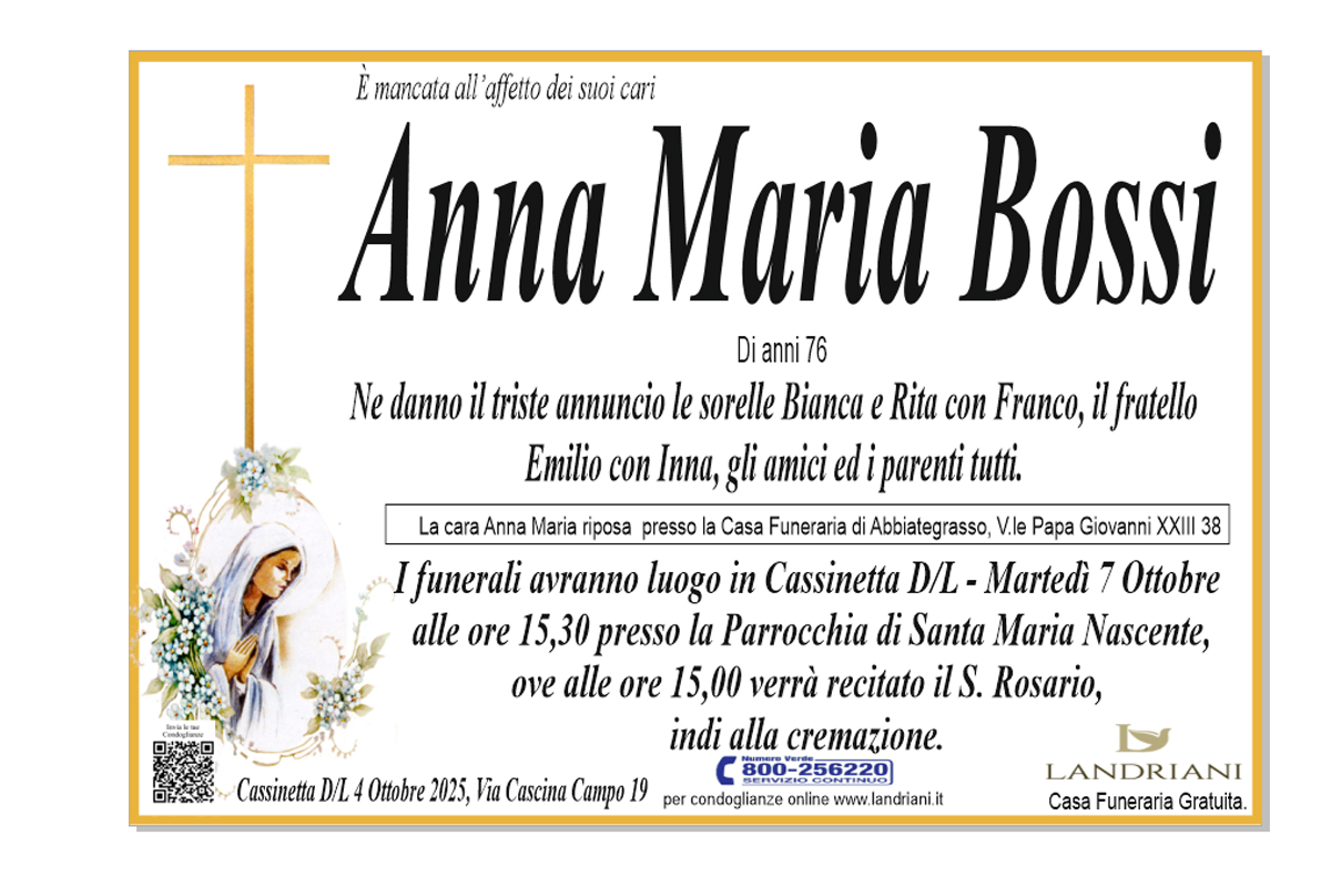 Lasciate un messaggio di cordoglio gratuito sarà nostra cura consegnarlo ai parenti di Anna Maria Bossi.
