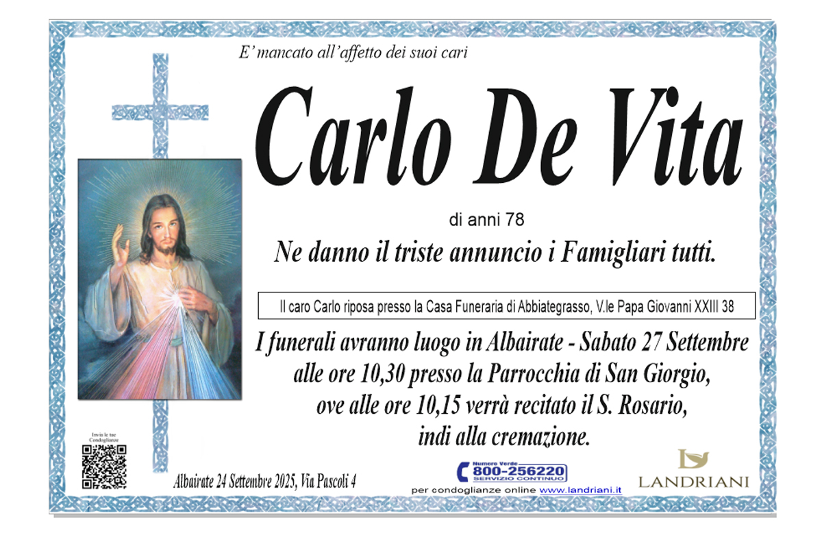 Lasciate un messaggio di cordoglio gratuito sarà nostra cura consegnarlo ai parenti di Carlo De Vita.