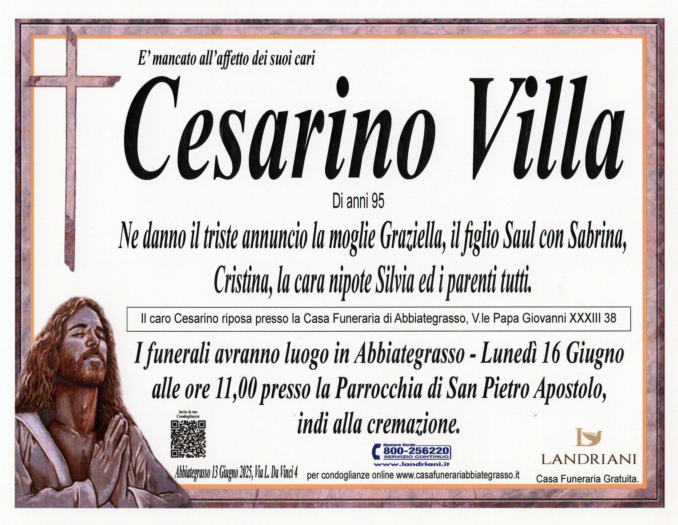 Lasciate un messaggio di cordoglio gratuito sarà nostra cura consegnarlo ai parenti di Cesarino Villa.