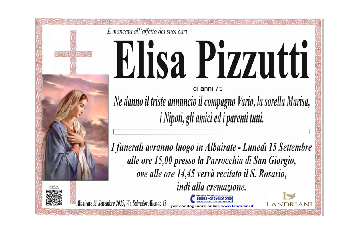 Lasciate un messaggio di cordoglio gratuito sarà nostra cura consegnarlo ai parenti di Elisa Pizzutti.