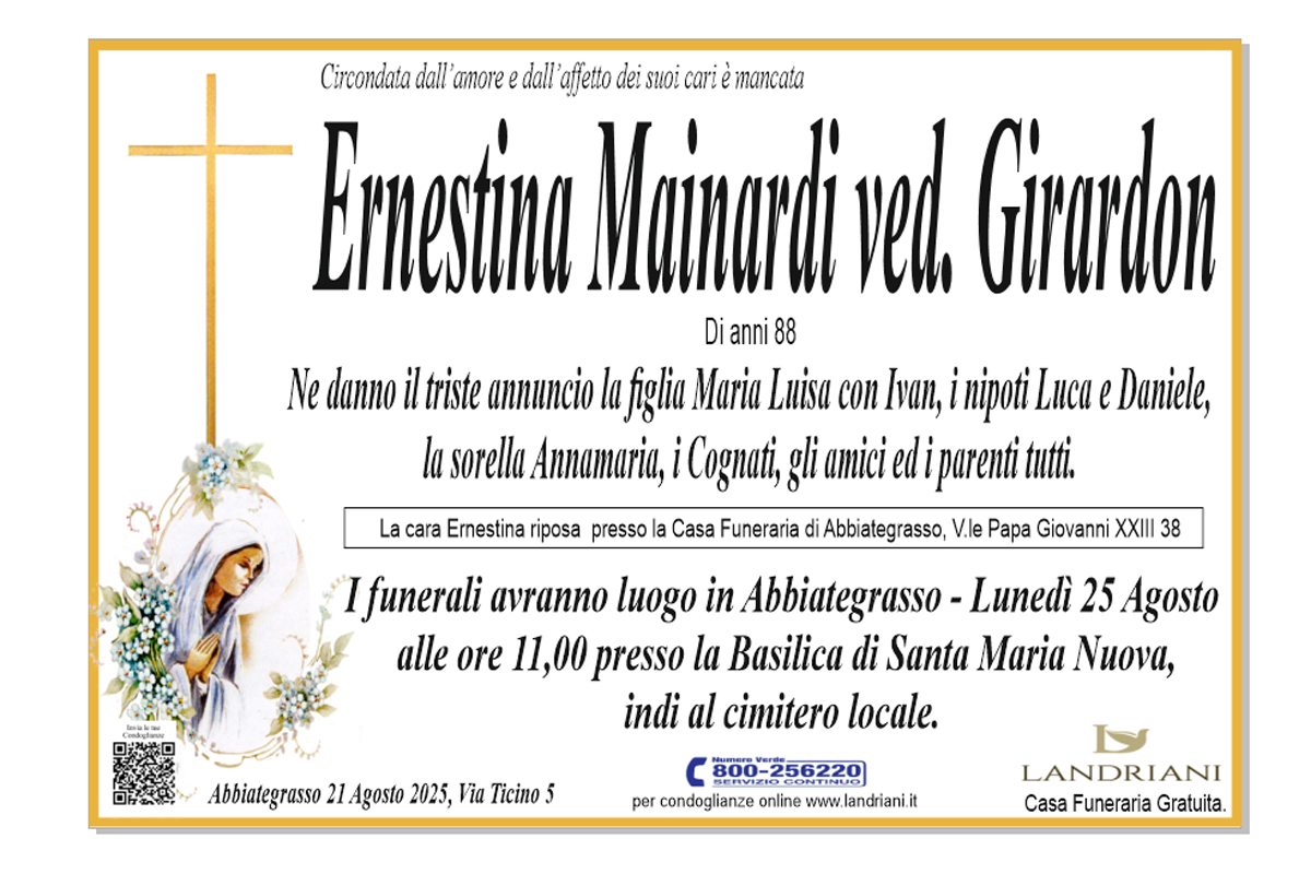 Lasciate un messaggio di cordoglio gratuito sarà nostra cura consegnarlo ai parenti di Ernestina Mainardi.