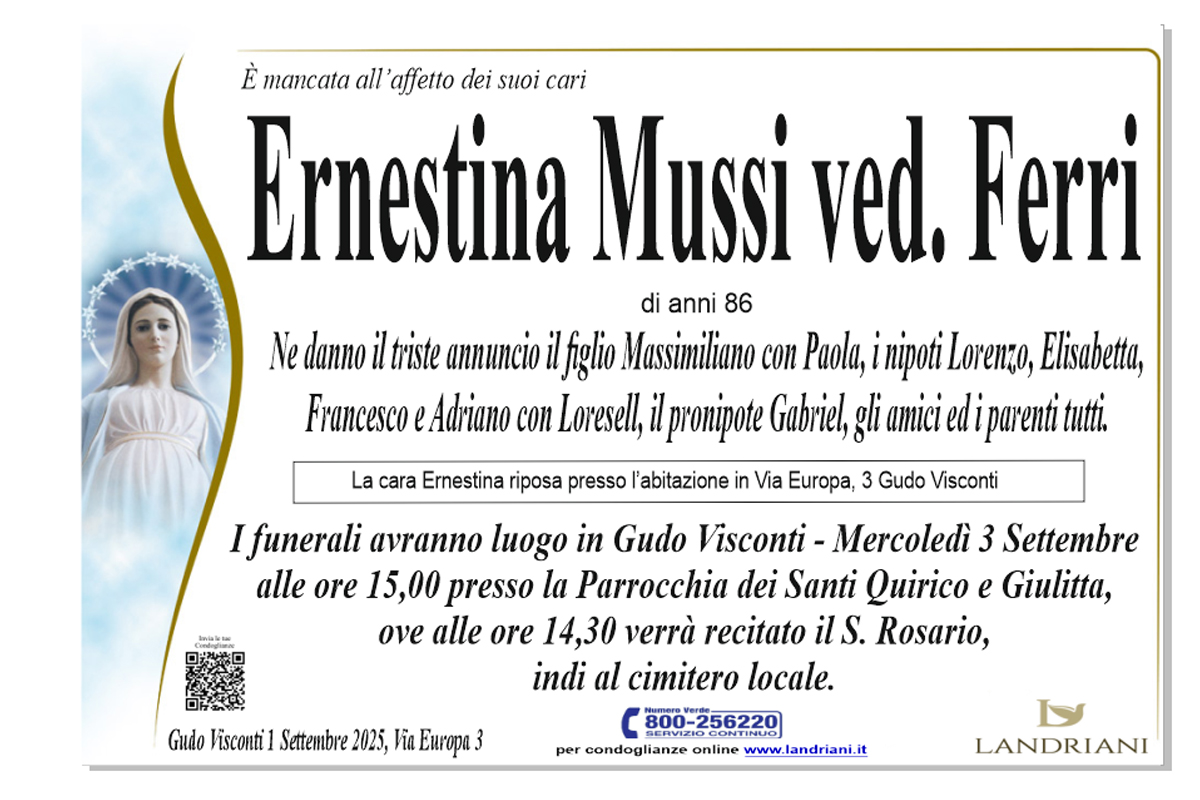 I funerali avranno luogo in Gudo Visconti – Mercoledì 3 Settembre alle ore 15,00 presso la Parrocchia dei Santi Quirico e Giulitta, ove alle ore 14,30 verrà recitato il S. Rosario, indi al cimitero locale.