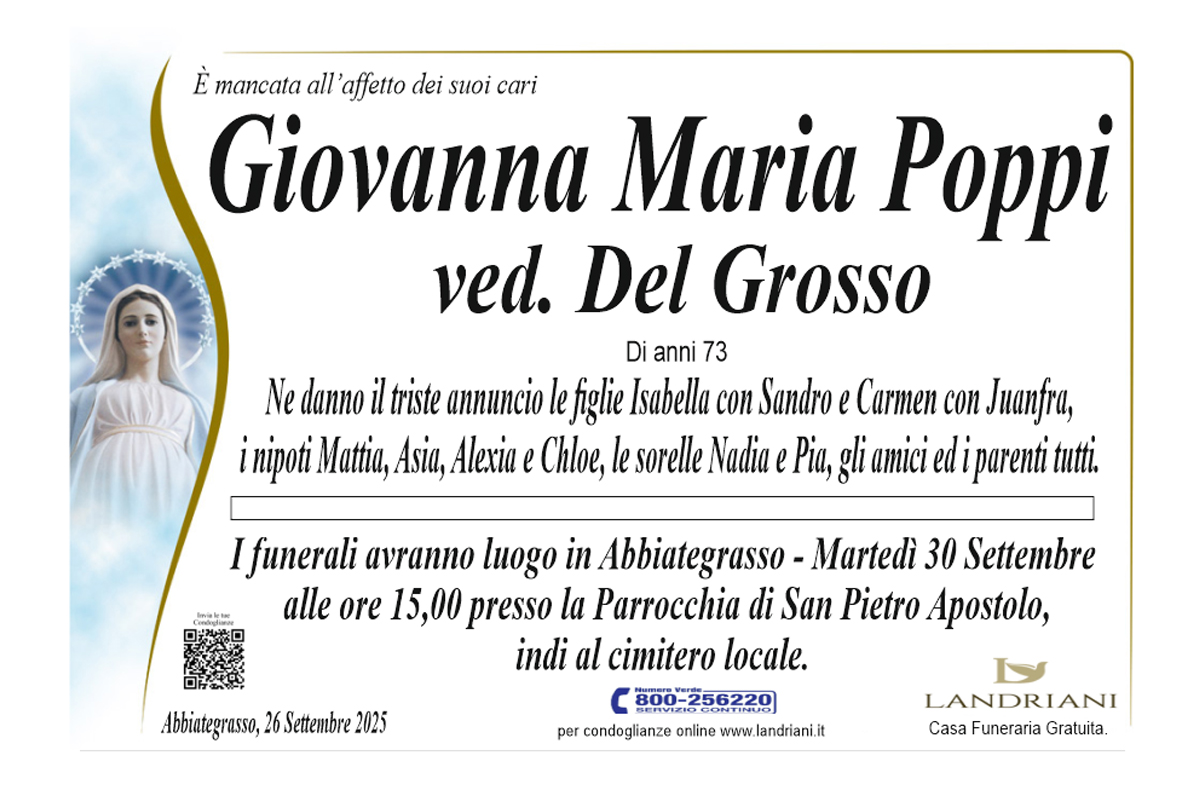 Lasciate un messaggio di cordoglio gratuito sarà nostra cura consegnarlo ai parenti di Giovanna Maria Poppi.