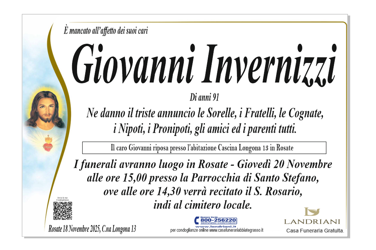 I funerali avranno luogo in Rosate – Giovedì 20 Novembre alle ore 15,00 presso la Parrocchia di Santo Stefano, ove alle ore 14,30 verrà recitato il S. Rosario, indi al cimitero locale.