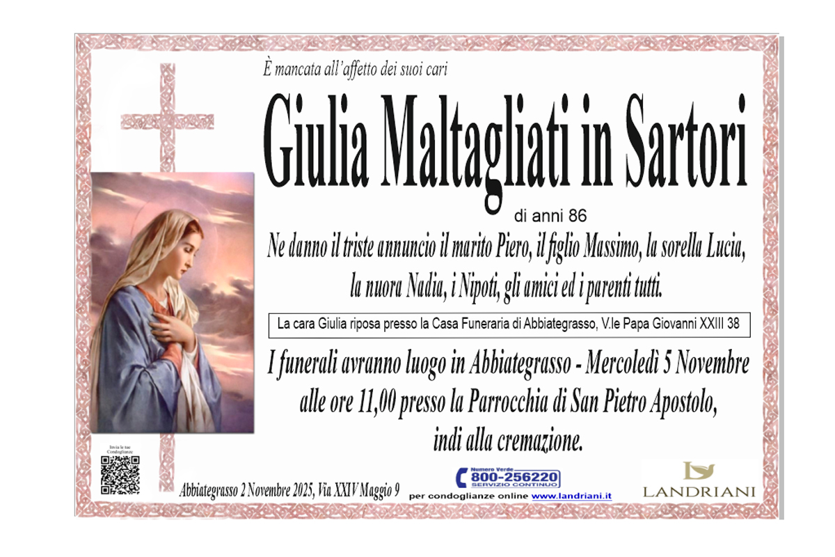 Lasciate un messaggio di cordoglio gratuito sarà nostra cura consegnarlo ai parenti di Giulia Maltagliati.