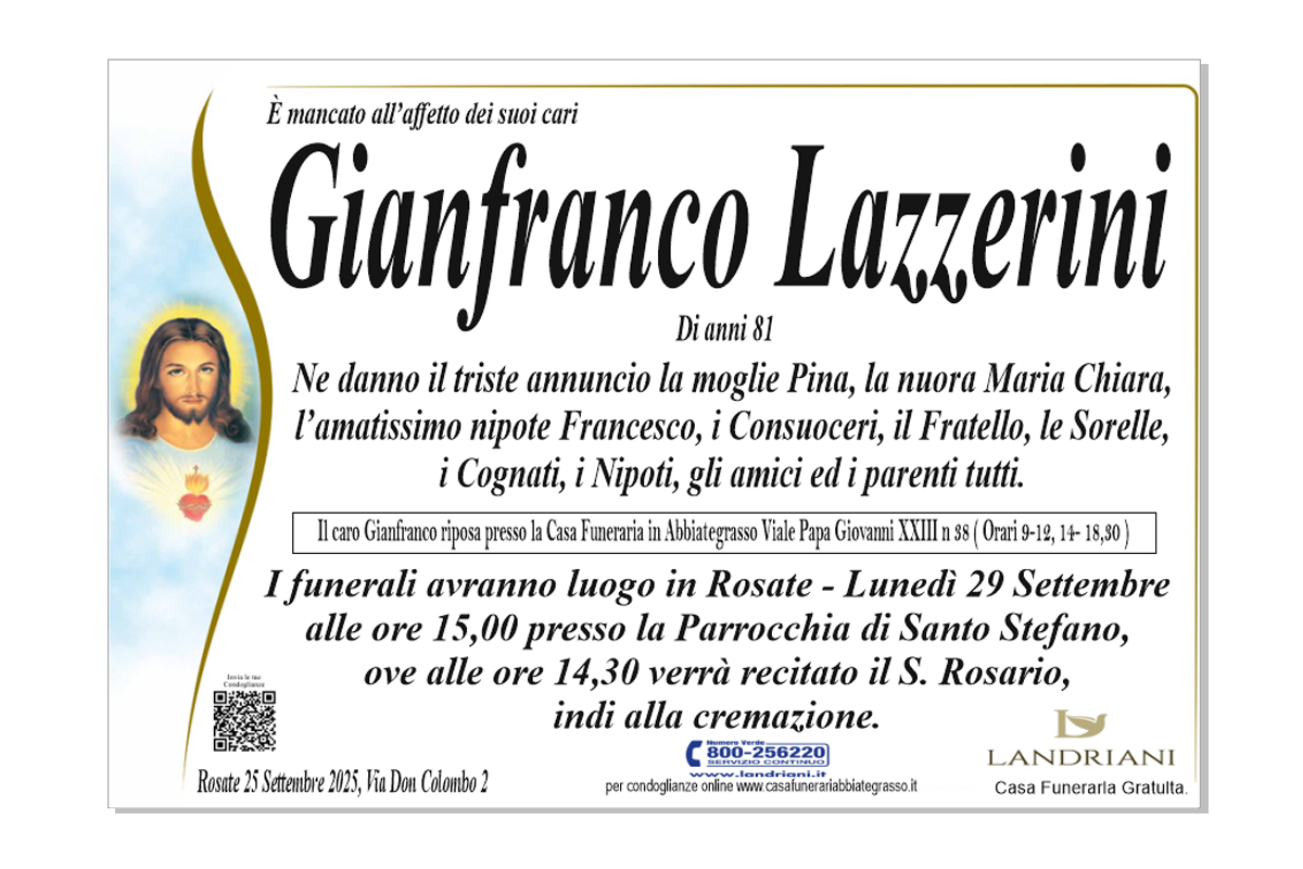 I funerali avranno luogo in Rosate – Lunedì 29 Settembre alle ore 15,00 presso la Parrocchia di Santo Stefano, ove alle ore 14,30 verrà recitato il S. Rosario, indi alla cremazione.