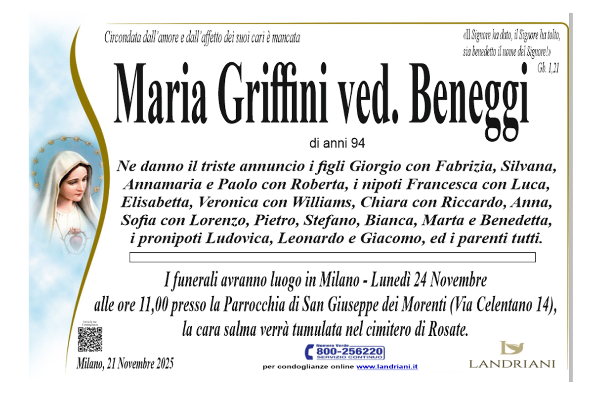 Lasciate un messaggio di cordoglio gratuito sarà nostra cura consegnarlo ai parenti di Maria Griffini.