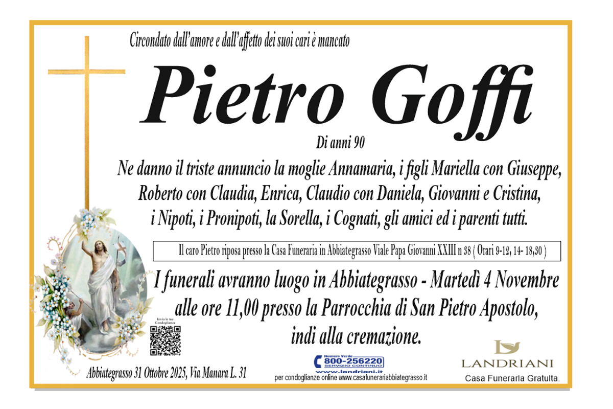Lasciate un messaggio di cordoglio gratuito sarà nostra cura consegnarlo ai parenti di Pietro Goffi.